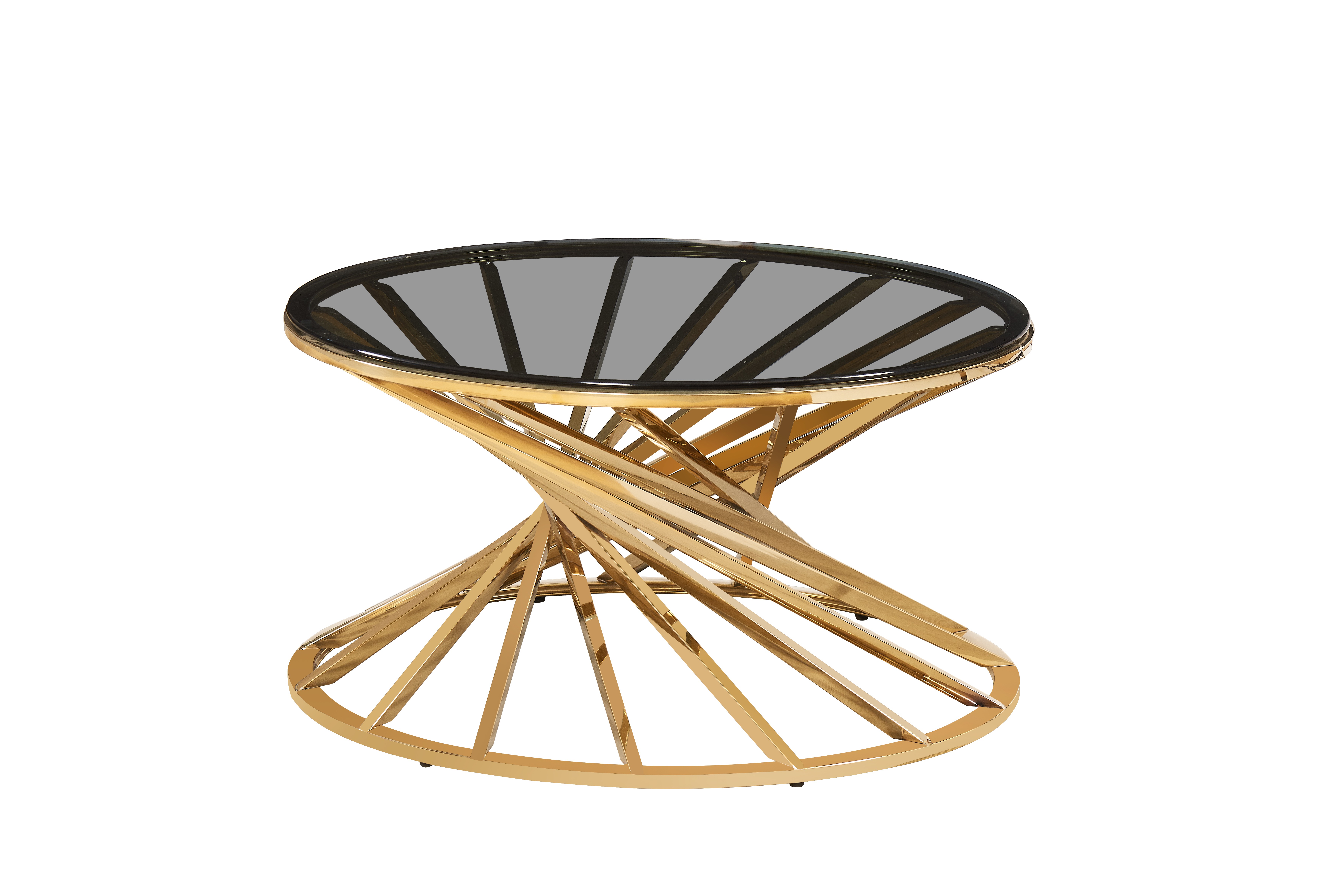 Conozca nuestra mesa de centro Gold-Twist : una combinación perfecta de estilo artístico y funcionalidad moderna, diseñada para realzar cualquier espacio con su llamativa base en espiral y su tapa de vidrio de primera calidad.