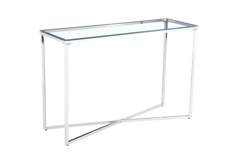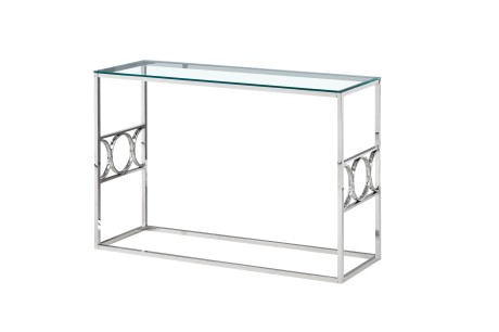 Top de vidrio templado transparente con marco de acero inoxidable plateado.