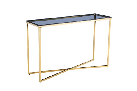 Top de vidrio templado gris con marco de acero inoxidable cromado con oro.