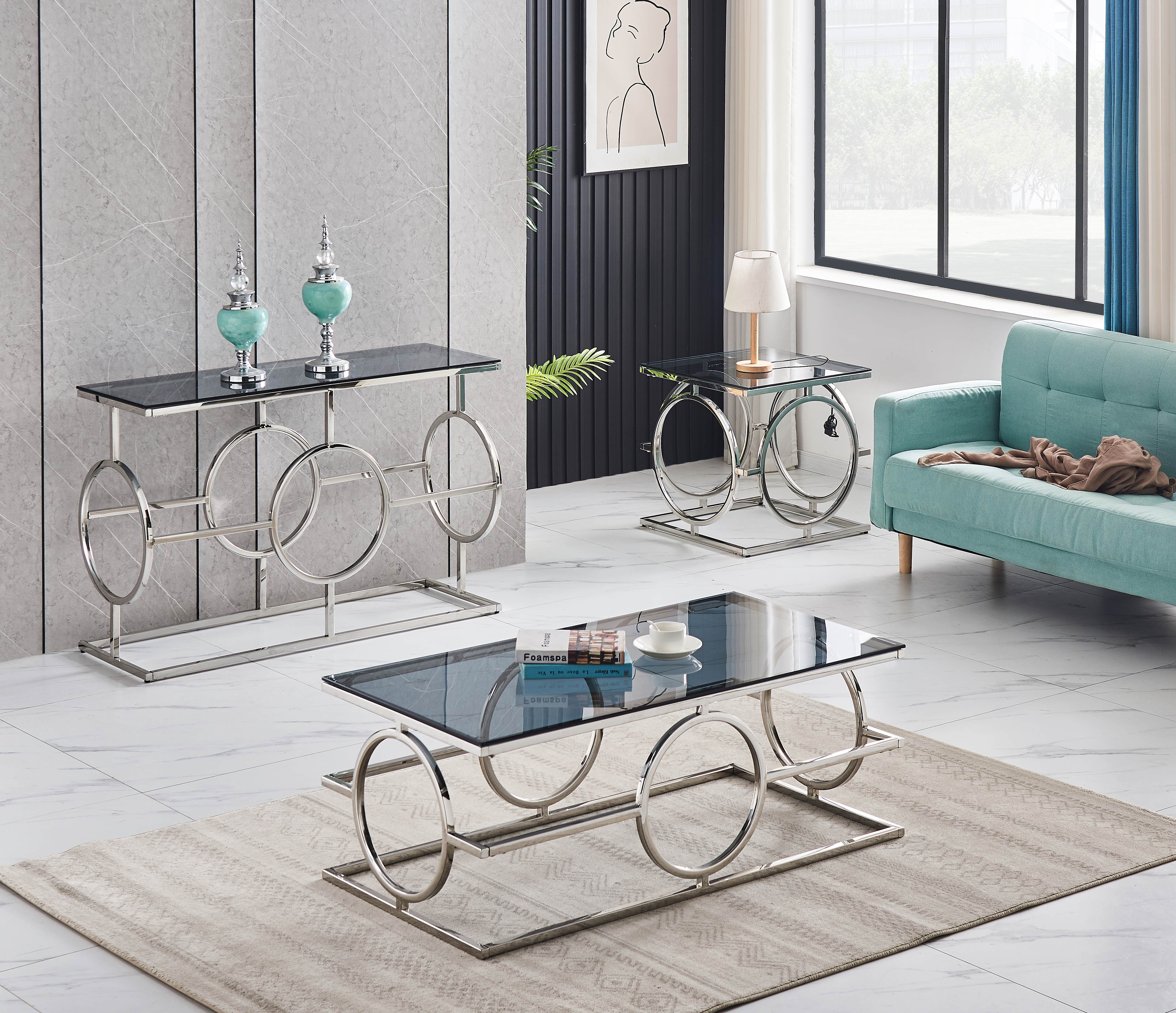 Conjunto moderno de muebles de acero inoxidable plateado: mesa consola + mesa de centro + mesa auxiliar
