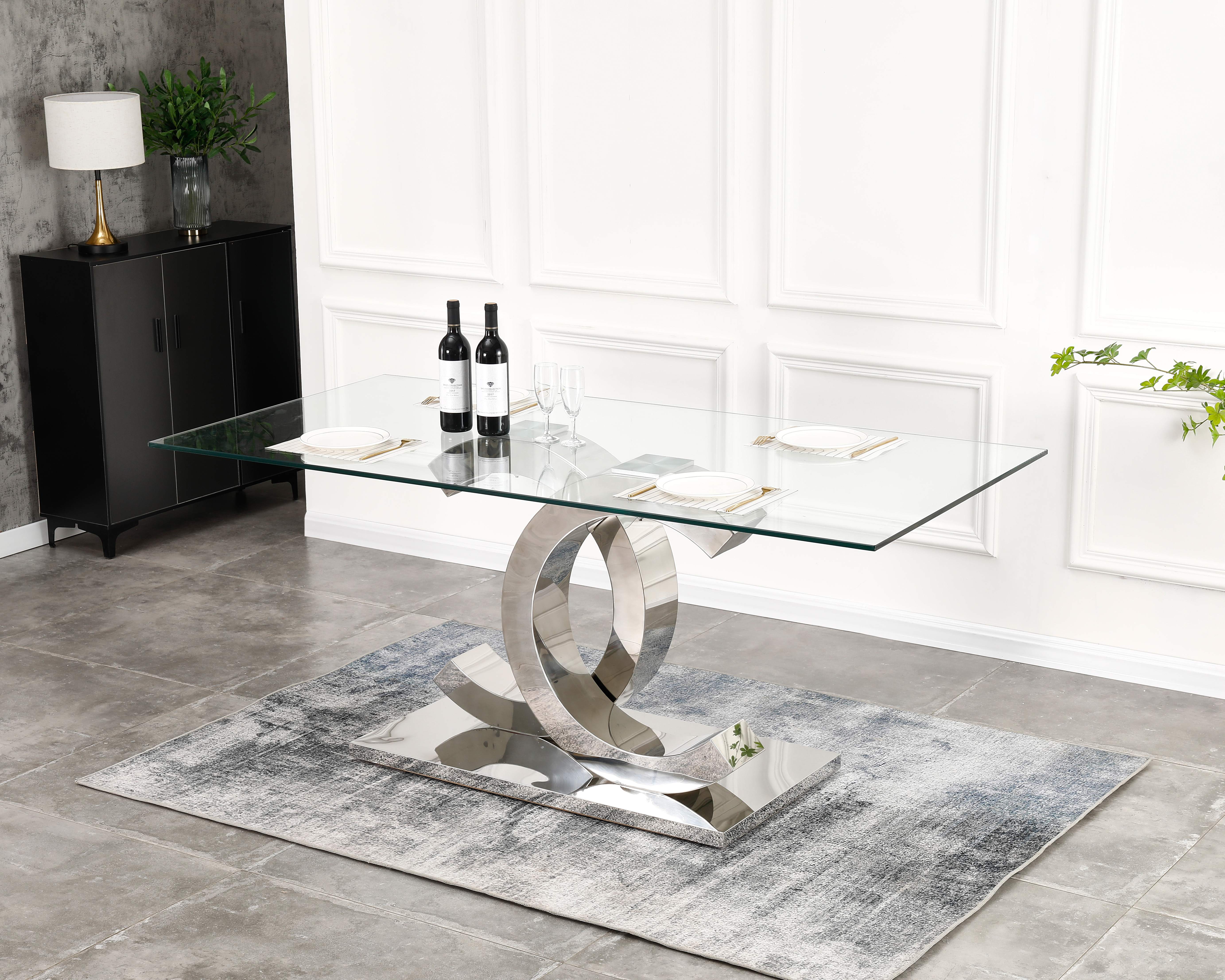 Cuenta con una espaciosa mesa de vidrio transparente templado de 180x90 cm combinada con una llamativa columna central de acero inoxidable plateado y una base elegante, que combina la estética minimalista con la sofisticación industrial. Este diseño encarna el encanto refinado de los diseños de mesas de comedor de acero inoxidable , lo que la convierte en una pieza destacada para espacios exigentes.