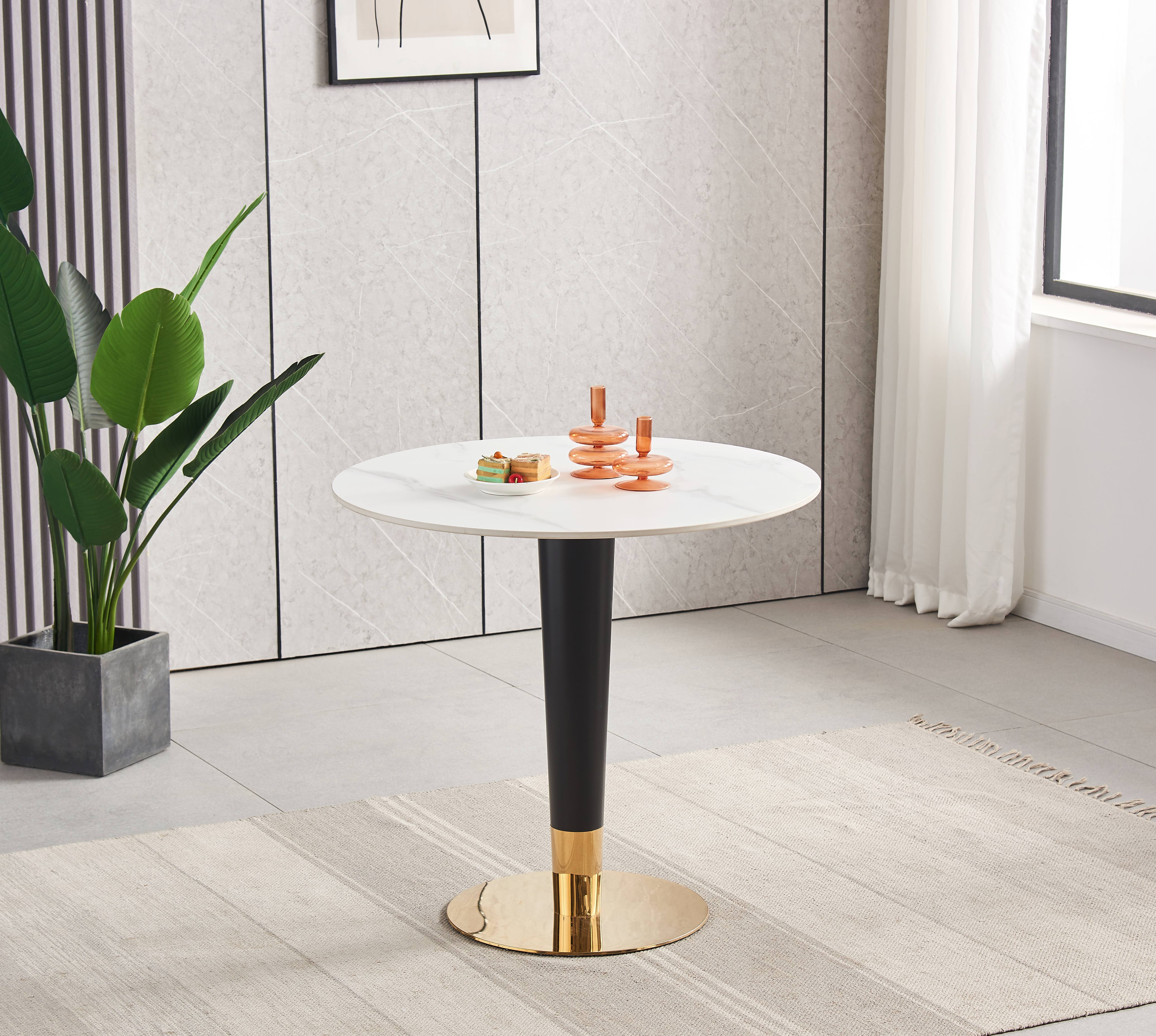 12mm thick white sintered stone top with natural gray veining for a luxurious, durable surface Black-powder-coated iron central column provides sturdy support Brushed stainless steel base with gold electroplating for elegant contrast *Sleek Design Features Minimalist round silhouette with clean lines Seamless transition between materials creates a sophisticated look Compact footprint ideal for small to medium spaces *Visual Appeal Natural stone veining adds organic texture Gold accents create luxurious highlights against dark base Neutral color palette complements modern interiors *Functional Benefits Durable construction for daily dining use Stable base prevents wobbling Easy to clean and maintain *Styling Suggestions Pairs beautifully with wooden or metal chairs Enhances both casual and formal dining areas Displays beautifully with decorative objects on surface ![]() This modern white stone dining table is designed to complement a wide range of interior styles, from minimalist to industrial. Its clean lines and neutral color make it versatile enough to fit into any space, while the unique texture of the sintered stone surface adds depth and character. Whether you're looking for a statement piece for your home or a functional addition to your restaurant or café, this dining table offers both form and function in equal measure. The key features of this dining table include its premium sintered stone top, which is resistant to scratches, stains, and heat, ensuring it remains in excellent condition for years. The iron base provides stability and durability, while the gold accents add a touch of luxury without being overwhelming. |
