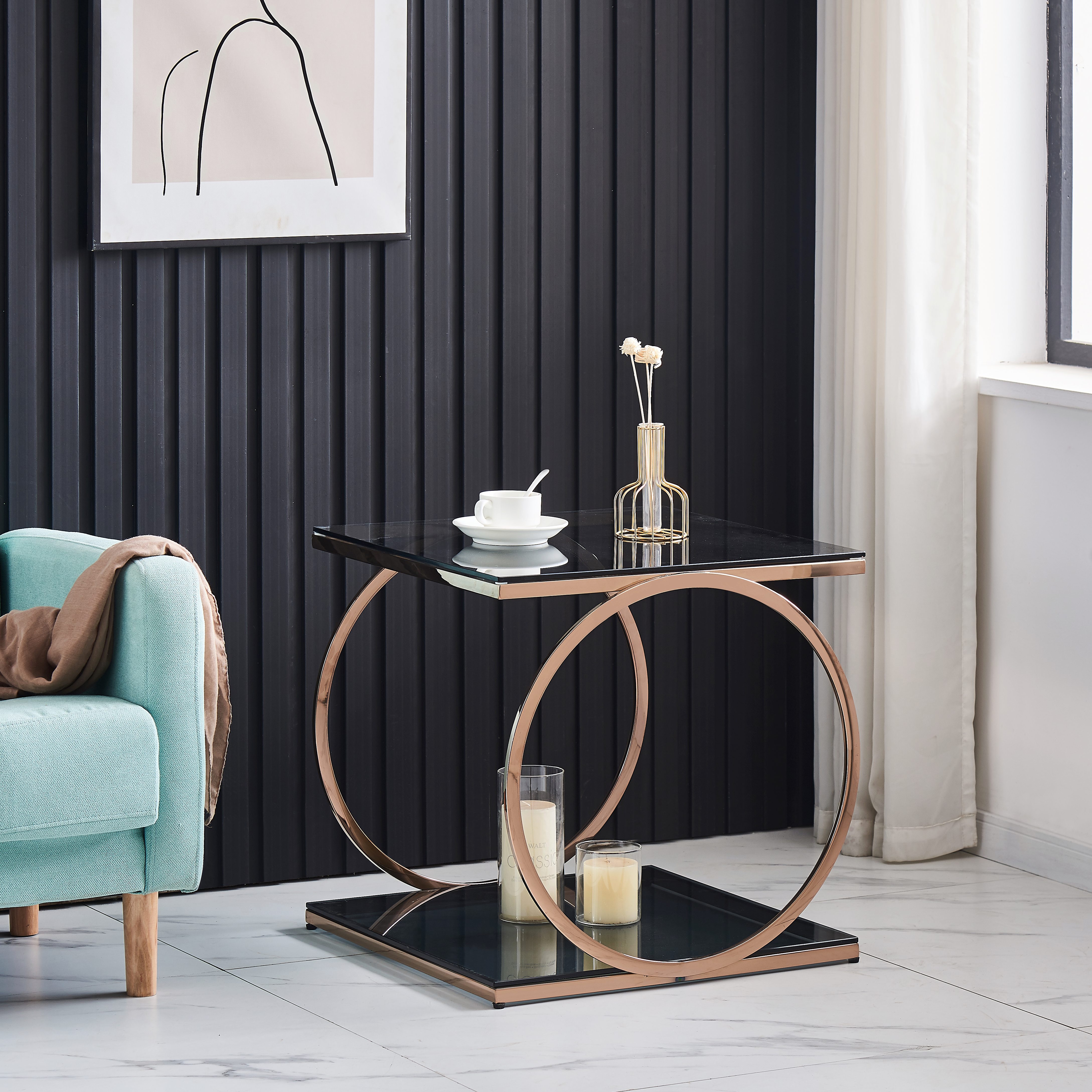 La mesa auxiliar de dos niveles en oro rosa destaca por su diseño contemporáneo y funcionalidad versátil. Con dos niveles, esta mesa ofrece un amplio espacio para libros, artículos decorativos o incluso una lámpara pequeña, lo que la convierte en una práctica mesa auxiliar para zonas de estar. Su acabado en oro rosa añade sofisticación y complementa interiores tanto modernos como tradicionales. Las suaves superficies de vidrio y la robusta construcción de acero inoxidable garantizan durabilidad y mantienen un aspecto refinado.