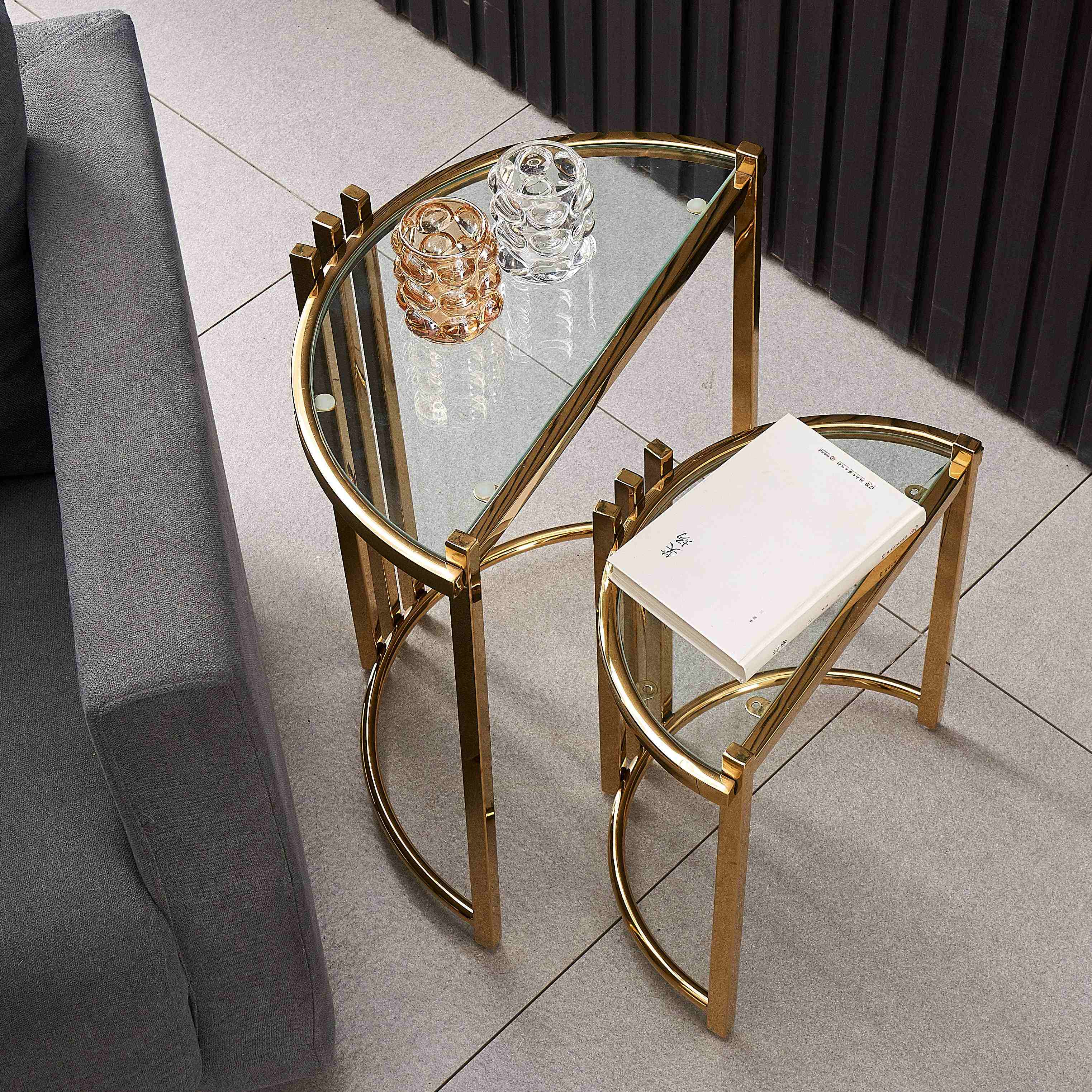 Descubra la mejor combinación de estilo y diseño inteligente con nuestras modernas mesas de anidación de vidrio, un conjunto de 2 piezas que transforma su espacio. Apilarlos para ahorrar 40% de área de piso o desarrollar para uso versátil como mesas laterales, mesitas de noche o organizadores de escritorio. Con topas de vidrio templado de 8 cm inhalador con claridad de cristal y costuras invisibles, estas tablas reflejan la luz y crean un efecto flotante. El marco de acero inoxidable de tono de oro ofrece resistencia y elegancia moderna, con jeraceo en V para estabilidad y almohadillas base para proteger sus pisos. Perfecto para pequeños apartamentos, interiores minimalistas o espacios de mediados de siglo, elevan sin esfuerzo cualquier habitación, desde salas de estar y habitaciones hasta oficinas caseras. Limpie con un golpe húmedo y disfrute de una solución elegante y de bajo mantenimiento que sea tan práctica como hermosa.