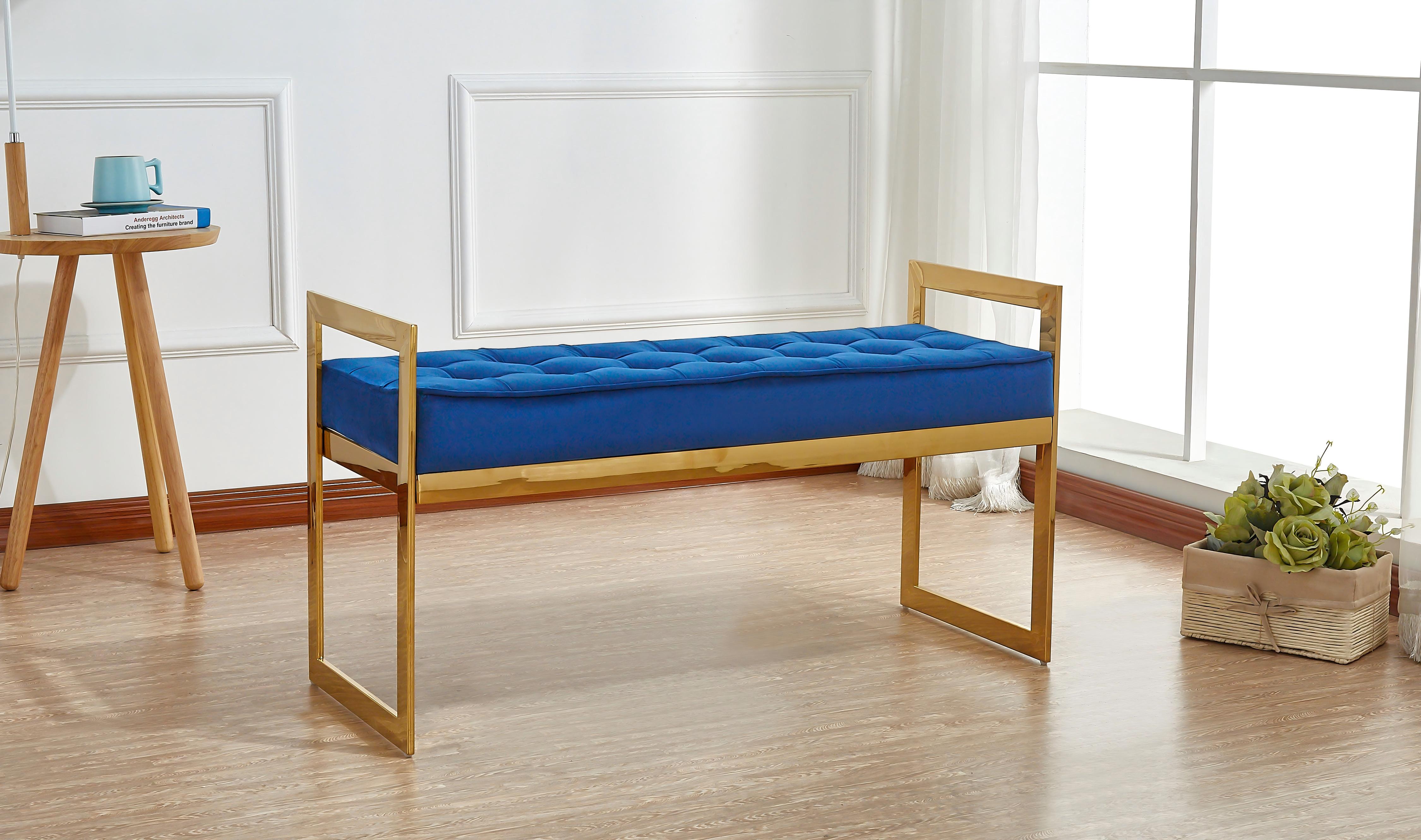 Transforme su espacio con este elegante banco azul marino con patas de acero inoxidable con tonos dorados para un toque moderno y elegante. Diseñado para la versatilidad, es perfecto como asientos de entrada, acento de dormitorio o silla de invitado adicional, compacto pero cómodamente lujoso. La tela resistente a las manchas y el marco a prueba de óxido aseguran la durabilidad en los hogares ocupados, mientras que el diseño de bajo perfil de 100 cm se ajusta perfectamente en espacios pequeños. Fácil de peinar con decoración de madera o plantas, agrega un vibrante toque de color a los interiores escandinavos, modernos o eclécticos. Las piernas limpias y la tapicería resistente a la mancha hacen que el mantenimiento sea fácil. Más que solo muebles: es una pieza de declaración que combina la forma, la función y el atractivo atemporal.