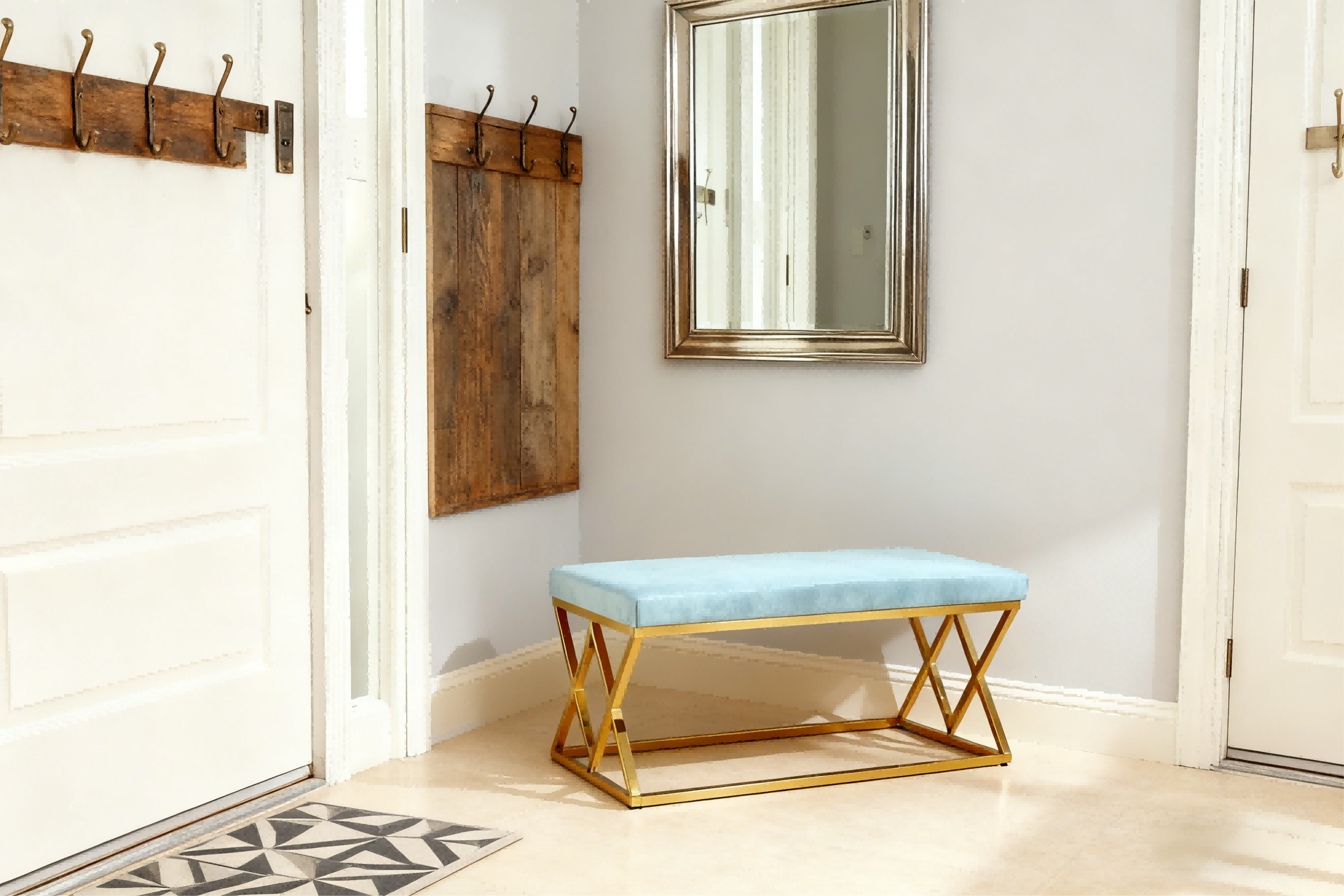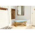 Transforme su espacio con este lujoso banco tapizado, que cuenta con una rica tapicería de terciopelo azul y un elegante diseño de marco en X chapado en oro que aporta elegancia moderna a cualquier habitación. Perfecto como banco de entrada, reposapiés o asiento decorativo en dormitorios o comedores, combina estilo y funcionalidad sin esfuerzo. Las duraderas patas de acero inoxidable resisten el óxido y los rayones, mientras que el terciopelo fácil de limpiar y el metal lavable garantizan una belleza duradera con el mínimo esfuerzo. Ya sea que esté saludando a sus invitados o agregando sofisticación a su decoración, este banco es la combinación definitiva de comodidad, durabilidad y encanto contemporáneo.